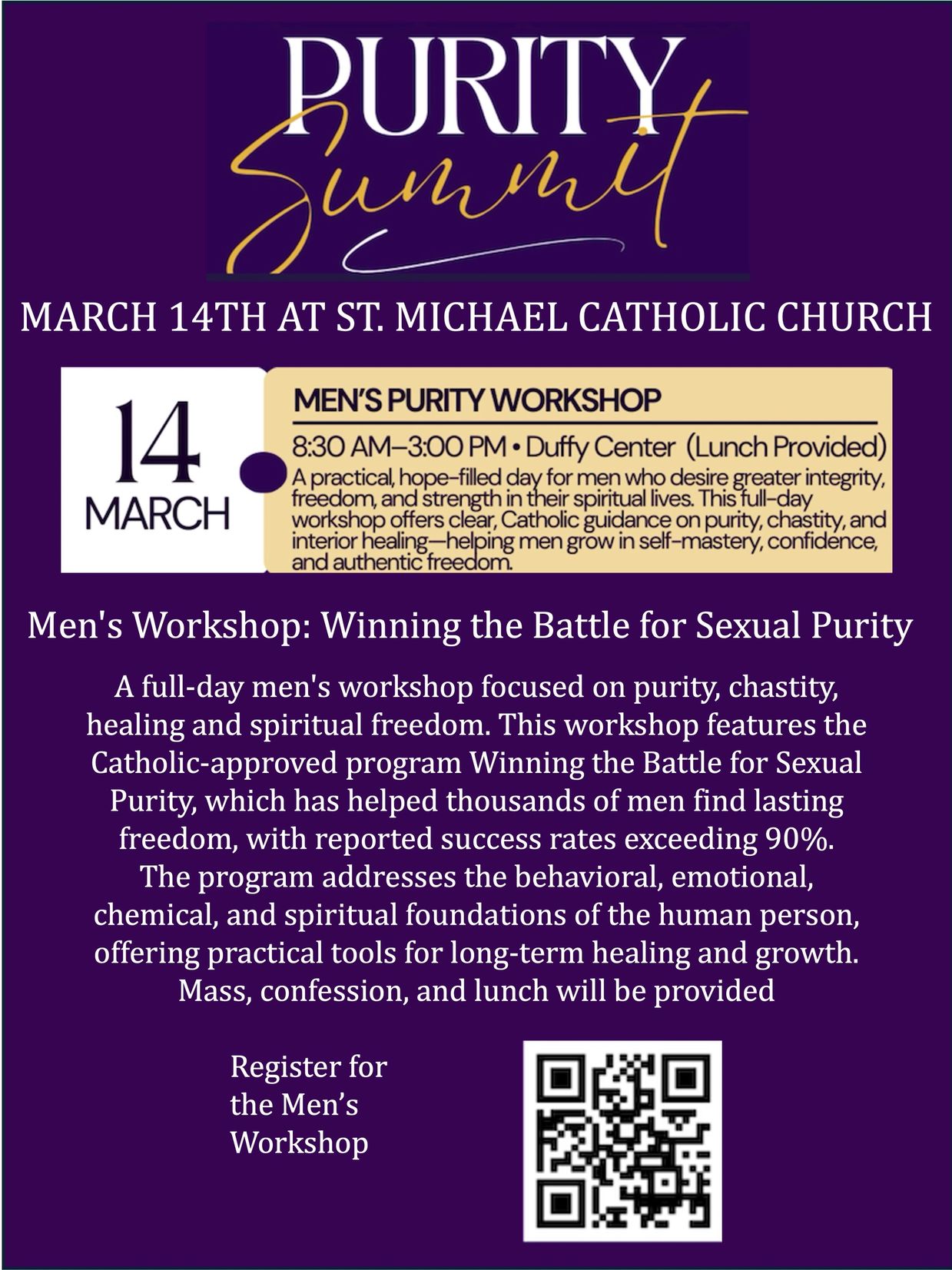 The Men's Purity Workshop will take place on Saturday, 14 March at Saint Michael Catholic Church, 542 Cypress Avenue, Murrells Inlet, SC. Advance registration is strongly advised so we know how many lunches and media artifacts we need to provide. Capture the QR code above to register for the seminar, or send an e-mail to corsaintmichaelsc@yahoo.com.